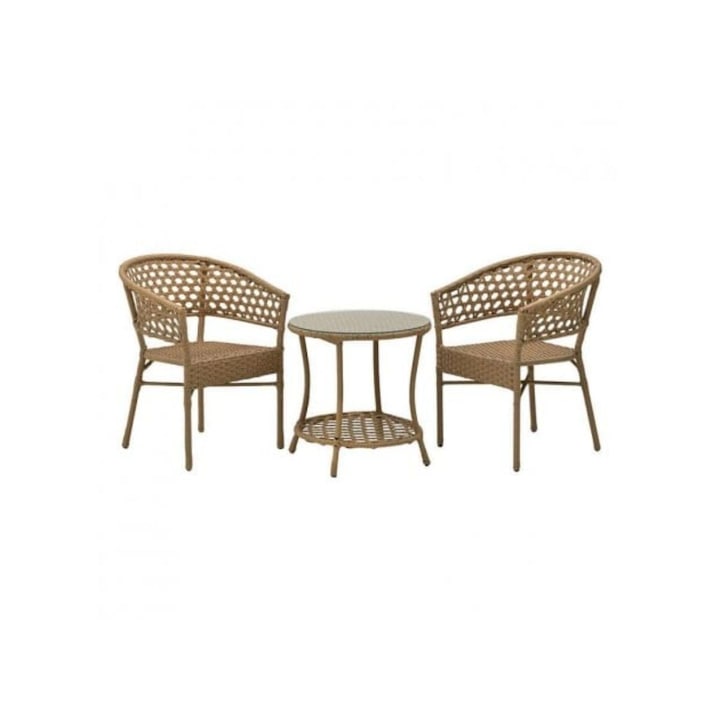 Alege acest set de mobilier extraordinar de comod proiectat sa reziste la intemperii variate. Textura asemanatoare cu ratanul este foarte realista. Setul include 2 scaune si o masa, toate fiind usor de asamblat.
