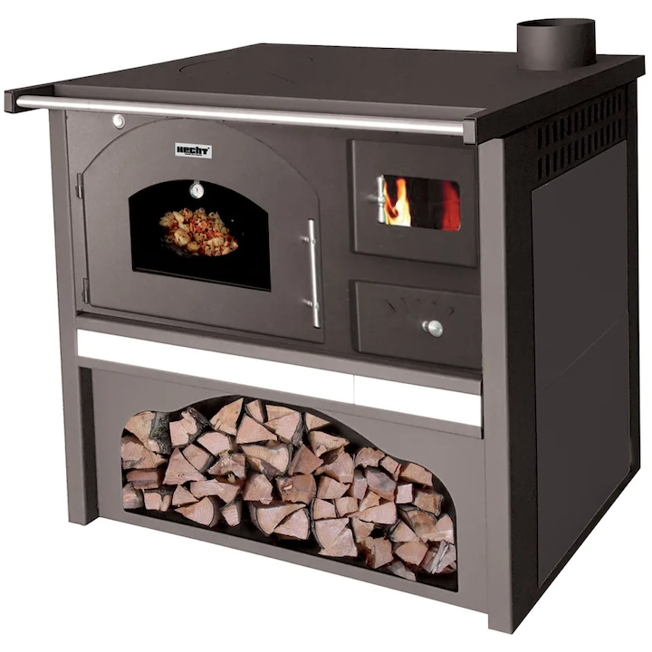 Soba cu plita si cupotor pe lemne HECHT Vulcanus, din otel, putere 6 kW, diametru evacuare 130 mm, usa cu sticla termorezistenta, pentru lemne, gri