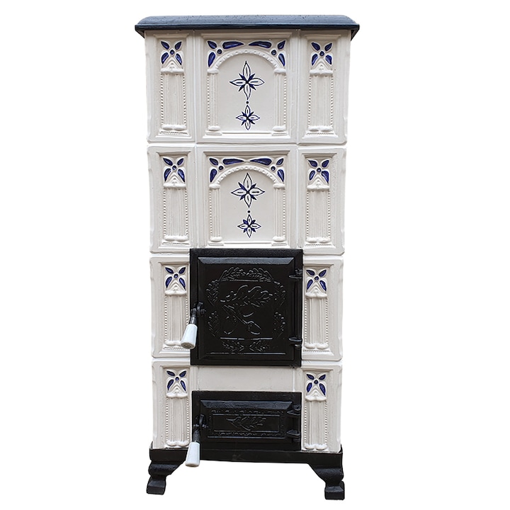 Soba teracota, MEDIAS, portabila, model Floare de colt, 6 kw, 44x44x114 cm, alb/albastru