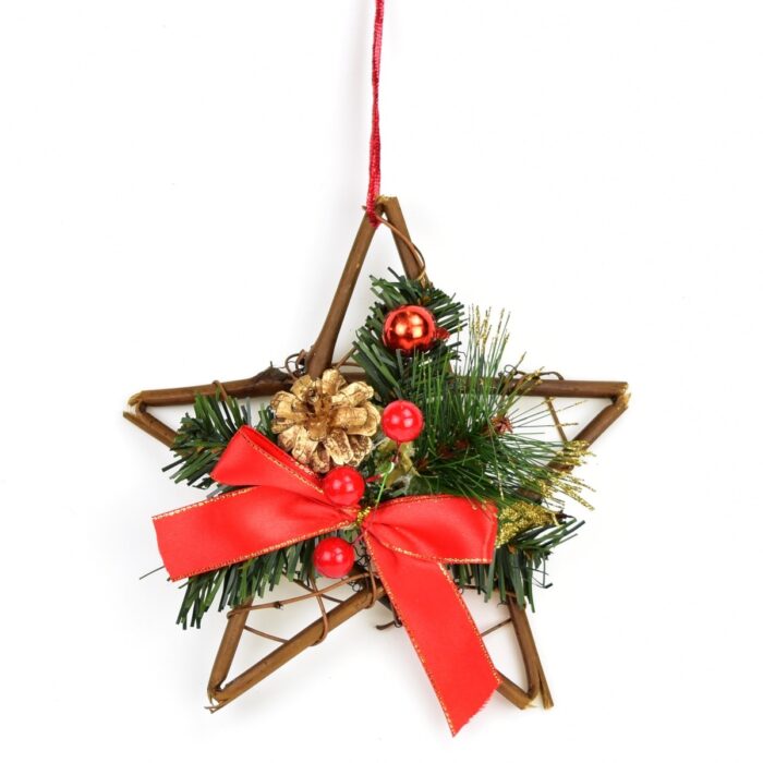 Lumineaza-ti decoratiunile de Craciun cu steaua noastra suspendata din rachita cu o funda rosie eleganta. Masurand 20 x 20 cm, aceasta piesa eleganta este perfecta pentru decorarea casei dvs. in timpul sarbatorilor. Steaua este decorata cu conuri de pin, bile si fructe de padure care adauga o nota de frumusete naturala si magia Craciunului. Acest produs nu este doar o alegere excelenta pentru decoratiunile dvs. de Craciun, ci aduce si confort si caldura in orice camera.