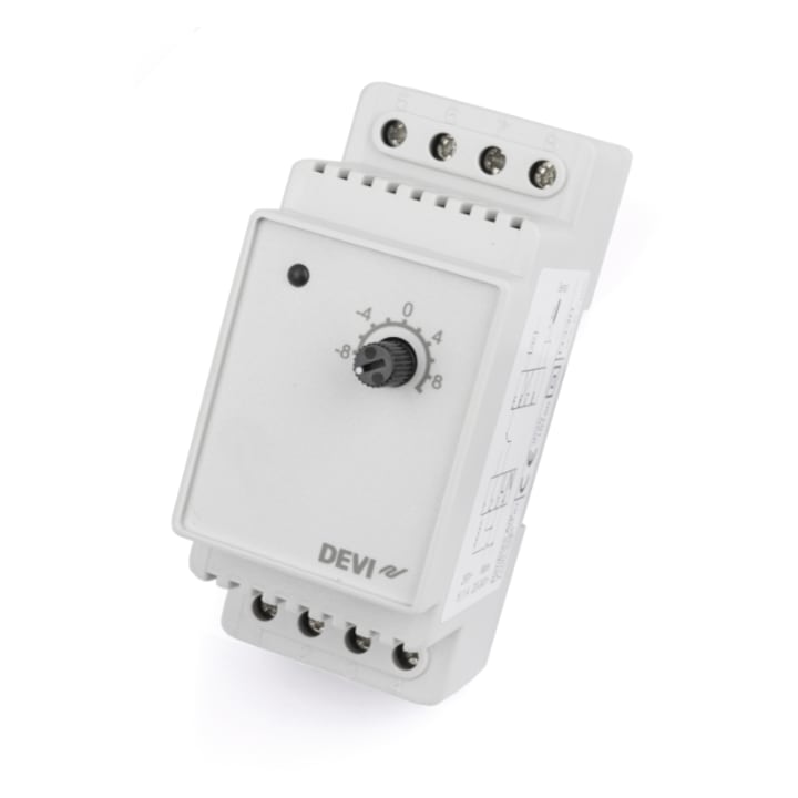 DEVIreg™ 330 (-10 – +10°C) este utilizat in principal pentru controlul unui interval de temperatura mai scazut precum protectia impotriva inghetului. Acest termostat are un buton pentru reglarea temperaturii cu o scara de la -10 °C la +10 °C. Senzor special de exterior cu fir alb inclus intr-un set.