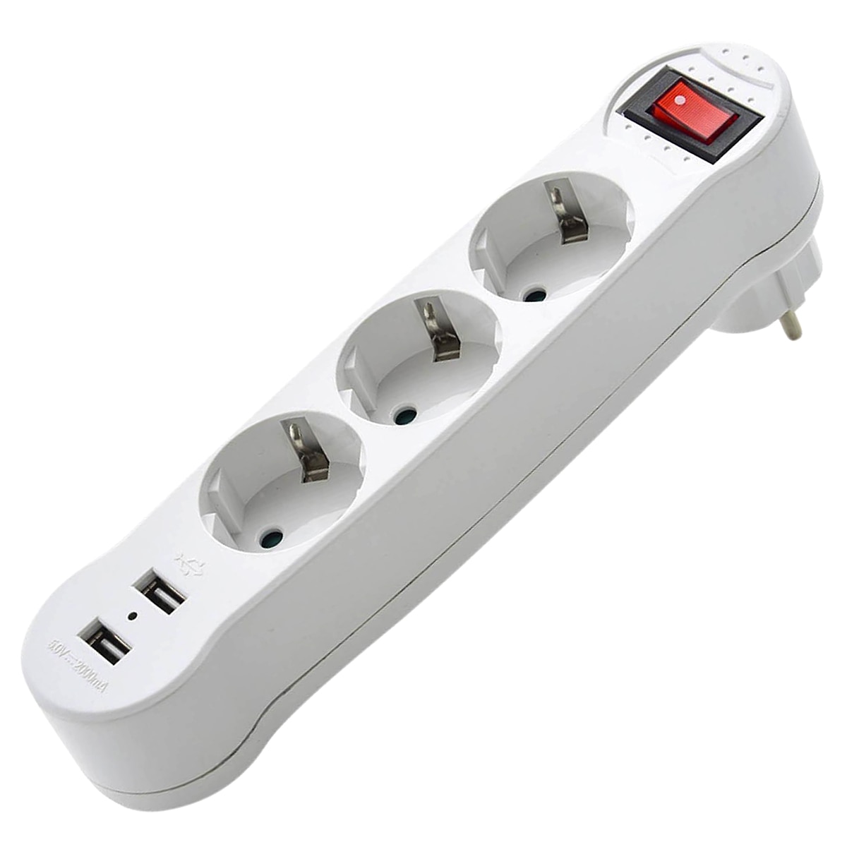 Triplu stecher cu trei posturi Shucko in linie, avand contacte din aliaj din alama si plastic ABS ignifug.