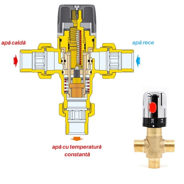 Vana de amestec termostatica USSPY, Instructiuni Romana, protectie antioparire, din alama, reglabila intre 20°C-50°C